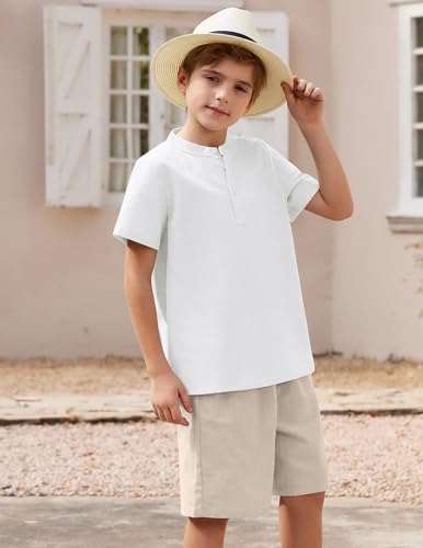 Arshiner Boy';s 2コットンリネンスーツカジュアルヘンリーシャツ半袖ビーチパンツ5-12歳子供サマースーツ