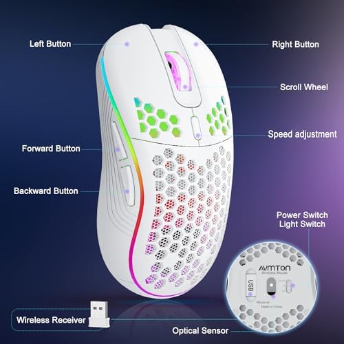 AVMTOMワイヤレスマウスワイヤレスゲームマウス充電可能PCマウスRGBバックライト6ボタン付き人間工学調整可能ノートパソコン、PC、パソコン、デスクトップ、ノートパソコンなどのゲームマウスワイヤレス(白)