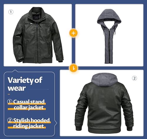JYG メンズ フェイクレザー オートバイジャケット 取り外し可能なフード付き