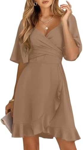 Dokotoo Women's Wrap V Neck Short Flared Sleeve Wedding Guest Dress