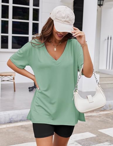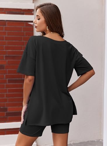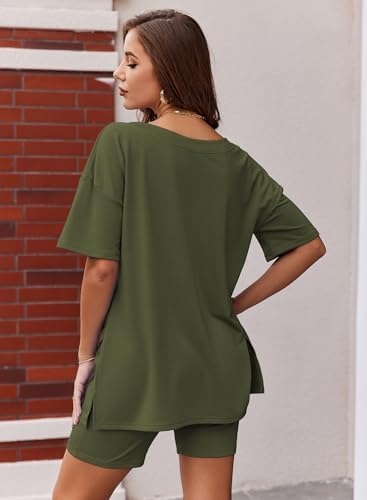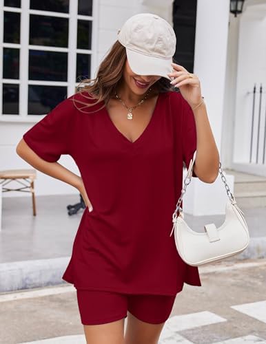 Ekouaerレディースパジャマ2点セットカジュアルスーツメガVネックTシャツトップスサイクリングパンツスーツスポーツウェアS-XXL