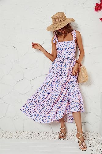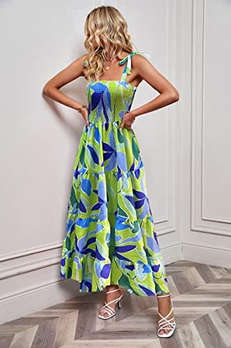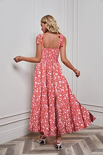 kinstell Women';s夏ボヘミアスパゲッティストラップスクエアネックフリルカジュアルフラワーロングスカートビーチスウィングパーティーMaxiワンピース