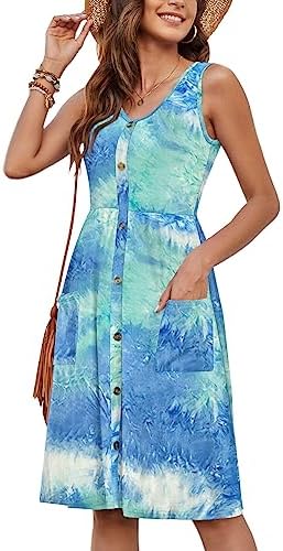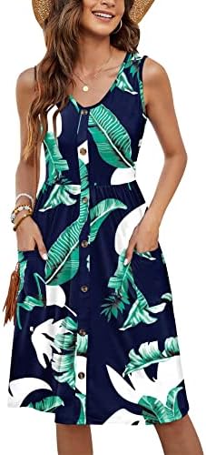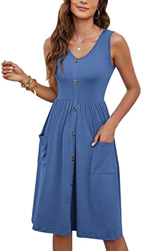 Women Summer Dresses Sleeveless Loose Swing Button Down Midi Dress with Pockets
