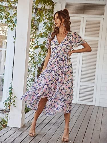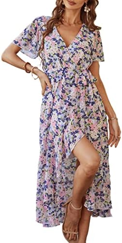 キレイなガーデンウーマン&39 ;s 2024花ボヘミアワンピース身にまとうVネック半袖束帯フリル裾A字花ロングスカート