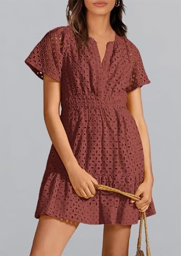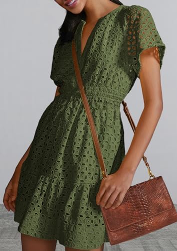 PRETYGARDENレディース2024サマースカートVネック半袖A字透かしレースフリルがキュートなカジュアルビーチパーティーワンピース