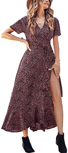 PRETYGARDENレディース夏巻きロングスカートカジュアルボヘミアンVネック半袖フリル裾開きビーチロングスカート