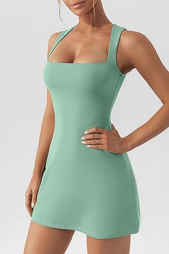 QINSEN Womens Square Neck Sleeveless Tank Dress Bodycon Bodice Flared Mini Dress