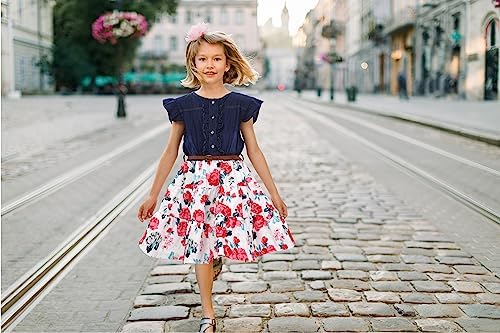 YJ.GWL ガールズ ドレス デニム 花柄 スイングスカート ベルト付き 女の子用 ファッション服 2~10歳用 ブルー US サイズ: 135cm/53" カラー: ブルー
