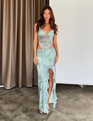 女性用セクシーフリルワンピーススパゲッティストラップ迷彩トップスタイトロングスカートクラブパーティースカート2点セット